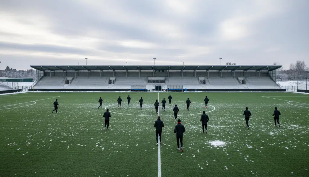 Årets første træning blev indledt klokken 13.30 på den sneklædte Hybel Arena Horsens. Den kolde kunstgræsbane ud mod Langmarksvej var stedet, hvor spillerne mødtes til deres første træningspas i det nye år, og selvom vejret var barskt, var der ingen tvivl om, at humøret var højt blandt spillerne.