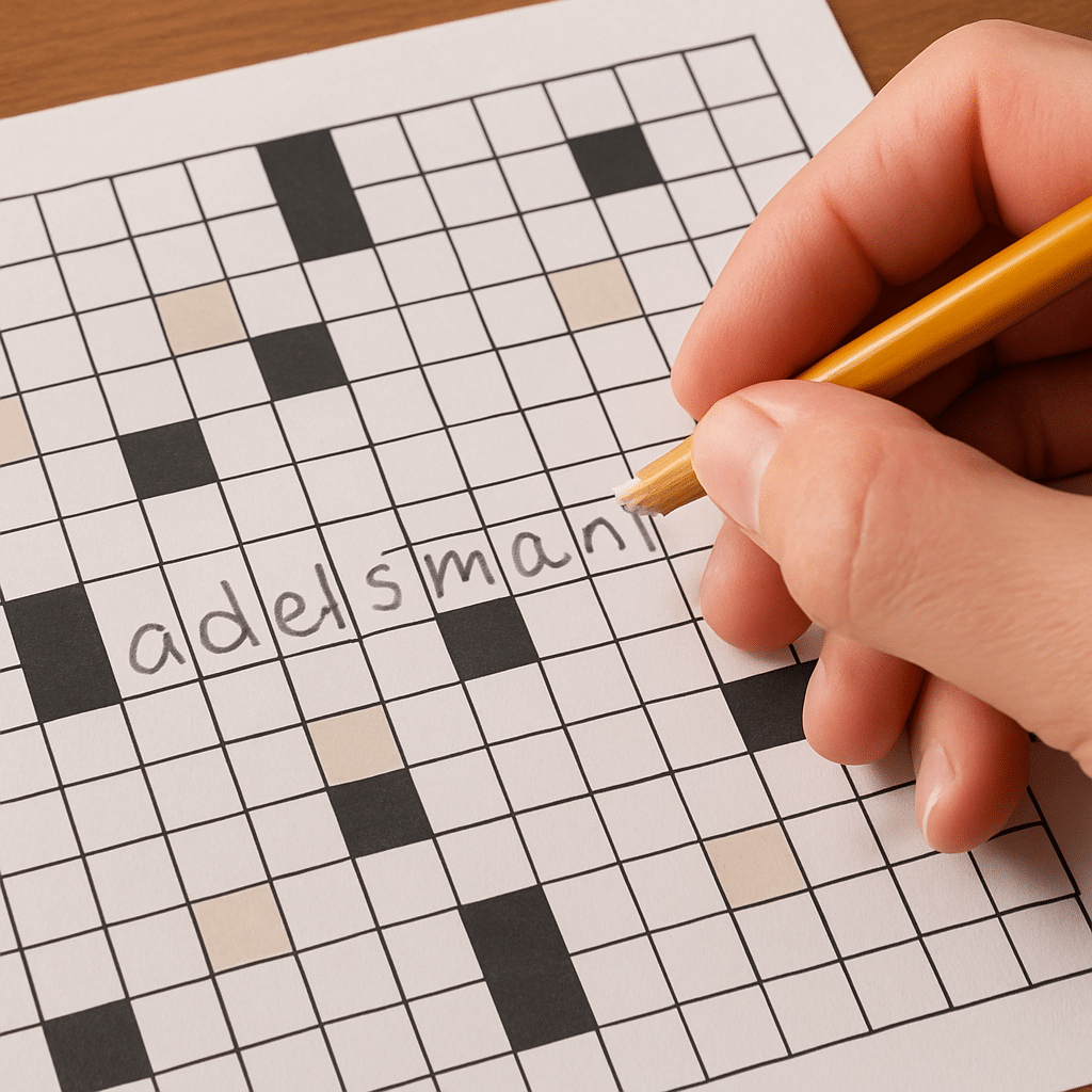 Person skriver ordet adelsmand med blyant i et krydsord på papir