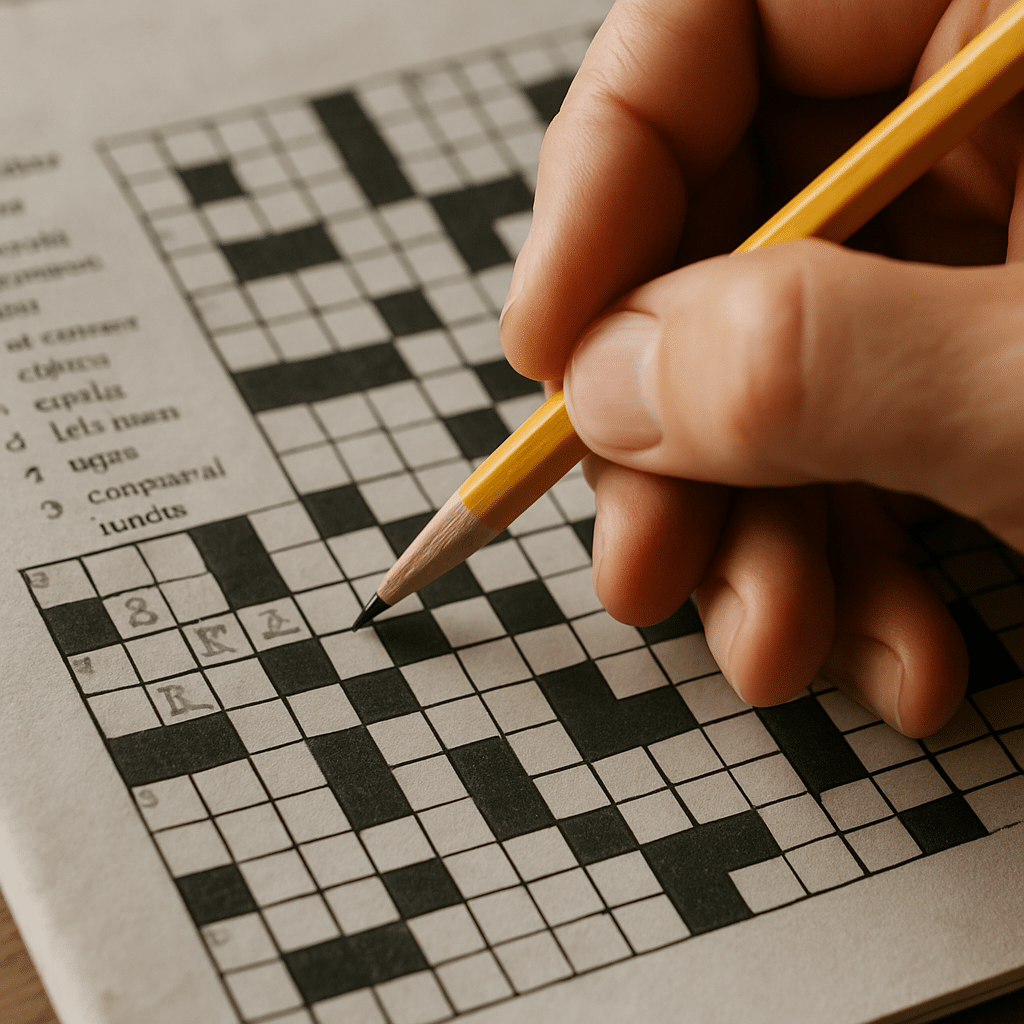 Person løser krydsord med blyant, skarpe tips og autentiske ledetråde til ægte løsninger