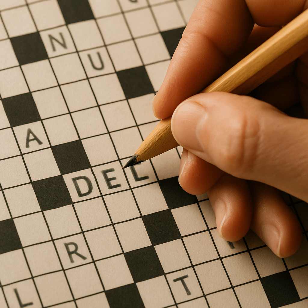 Hånd, der skriver i et krydsord med ordet 'del' fremhævet for at finde geniale løsninger