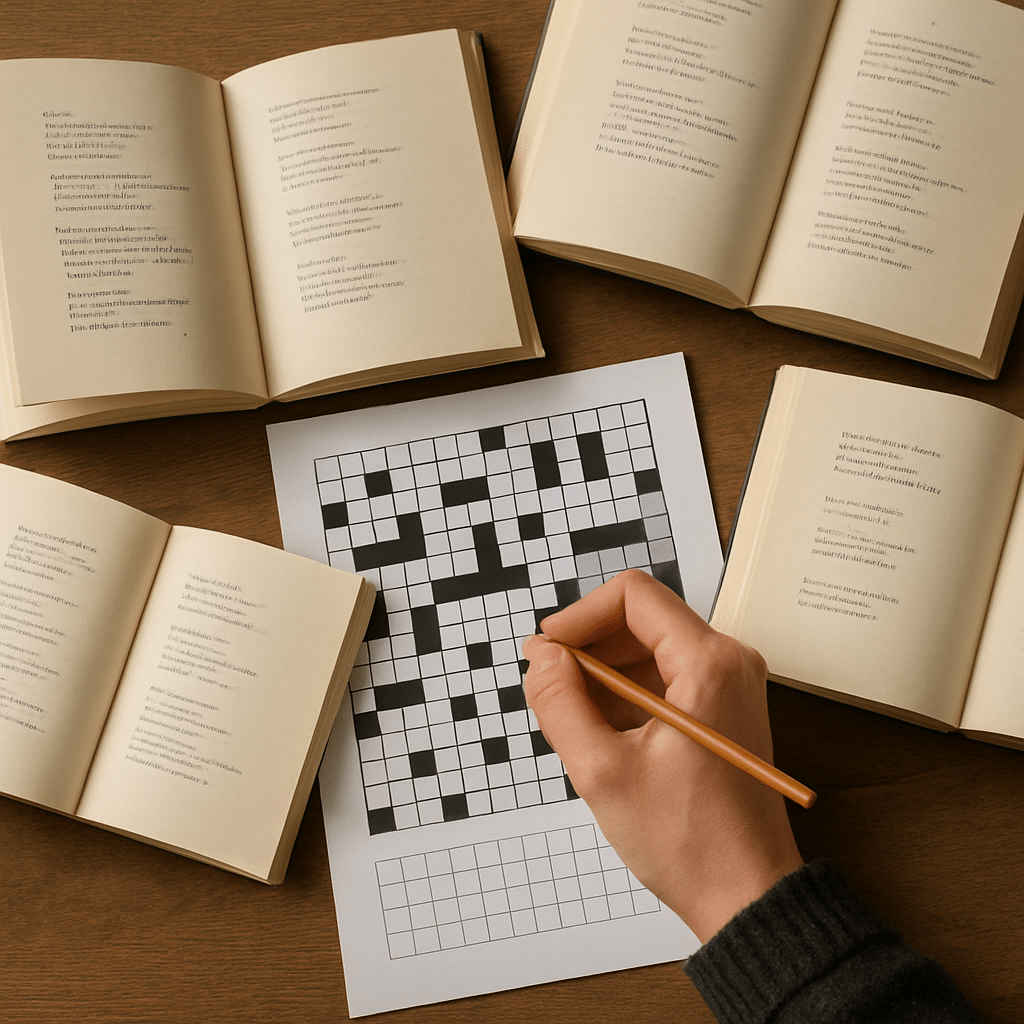 Person skriver i digt krydsord med blyant, omgivet af åbne digtsamlinger og poetisk inspiration