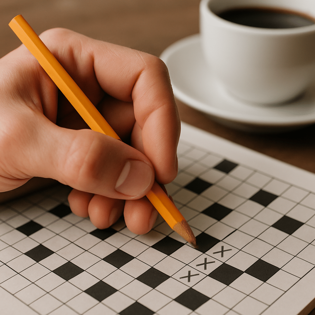 Nærbillede af hånd, der udfylder krydsord med ’evne’-ord, blyant og kaffekop i baggrunden