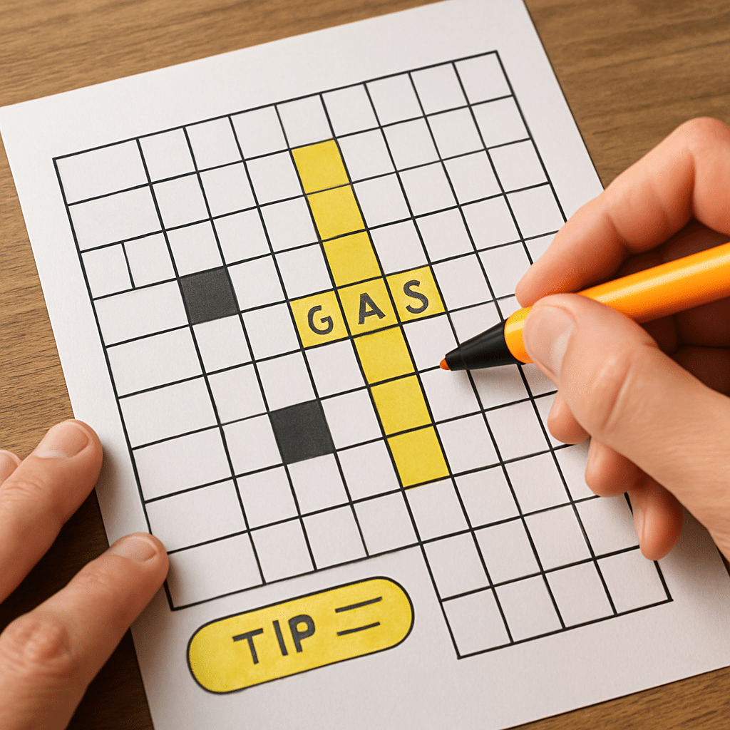 Person løser krydsord med gas-synonymer på papir, fremhæver tip og løsningsord i felterne.