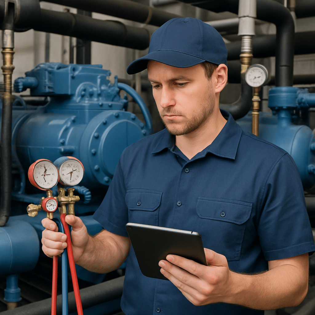 Køletekniker med måleværktøj og tablet foran industrielle køleanlæg, gennemgår lønstatistik for 2024