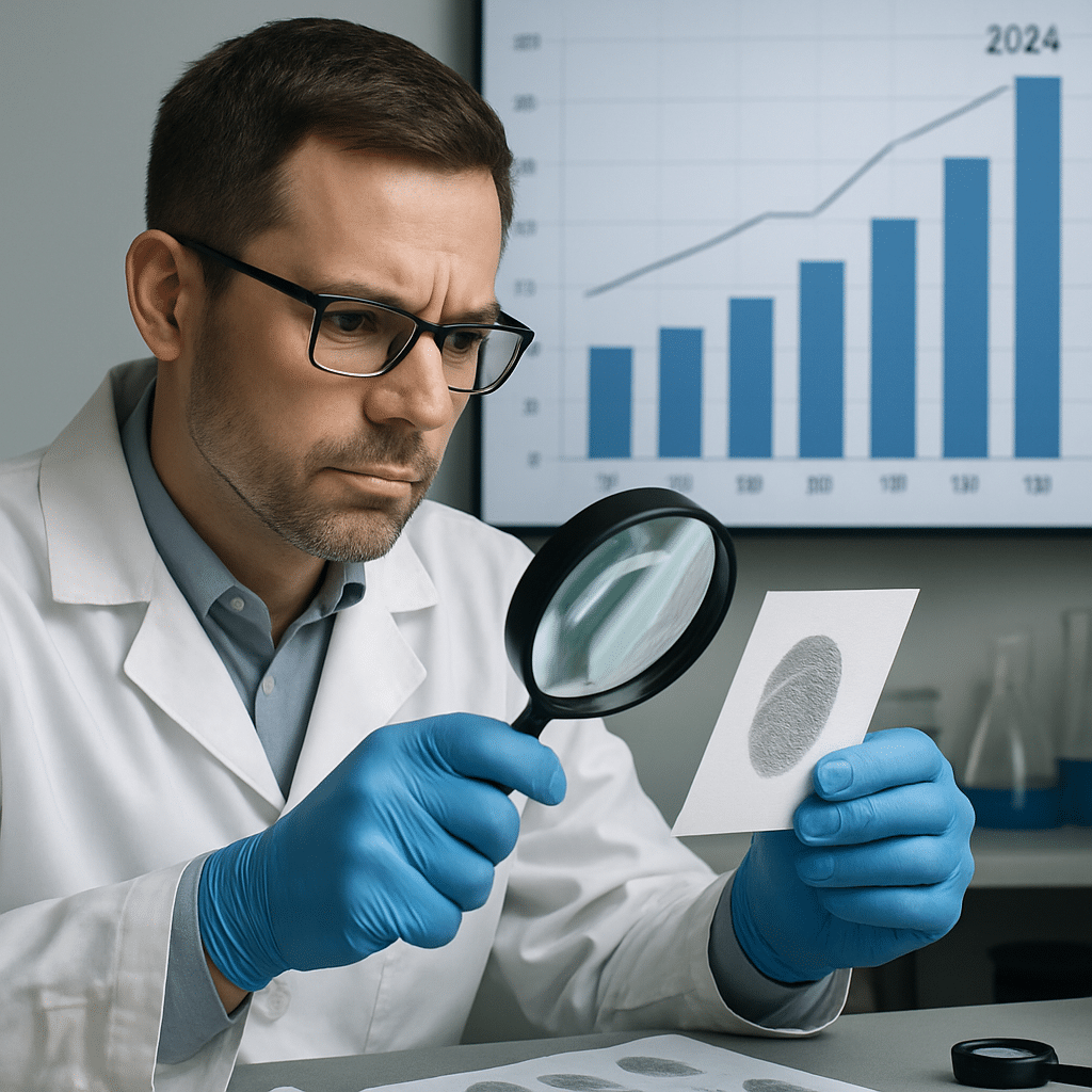 Kriminaltekniker undersøger fingeraftryk i laboratorium, mens en graf i baggrunden viser lønstatistik for 2024.