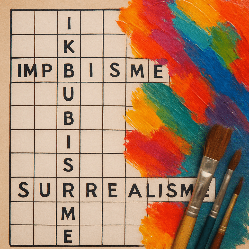 Krydsord med kunstretningstema – ord som impressionisme, kubisme og surrealisme ved siden af farverige penselstrøg