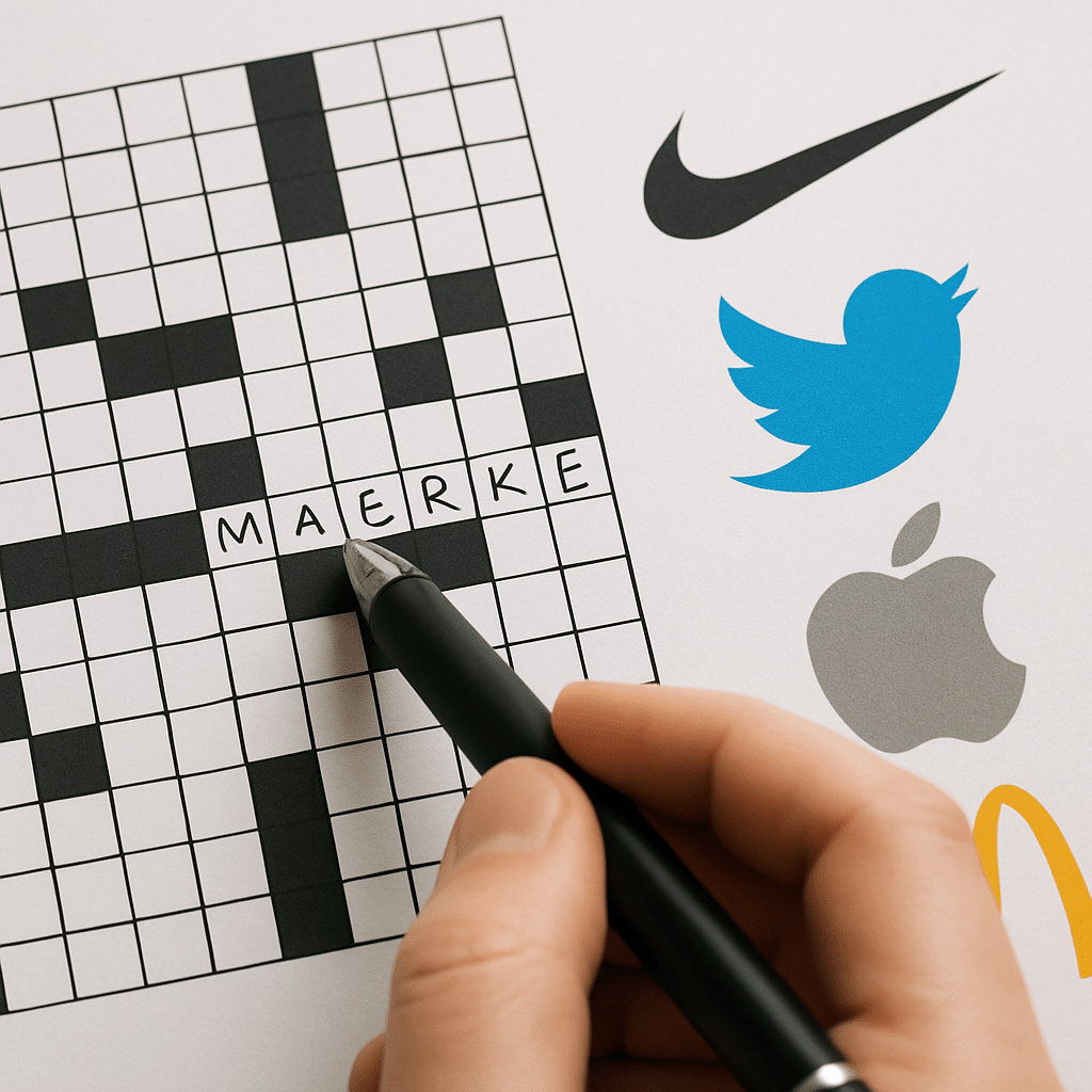 Hånd skriver svar i krydsord med ordet mærke og kendte varemærker ved siden af