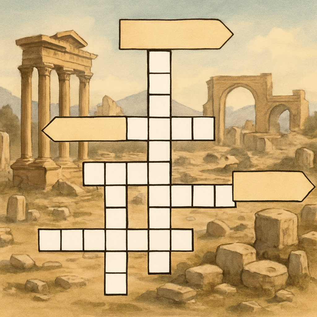 Krydsord med ledetråde om oldtidsby med antikke ruiner og historiske bygningsfragmenter i baggrunden