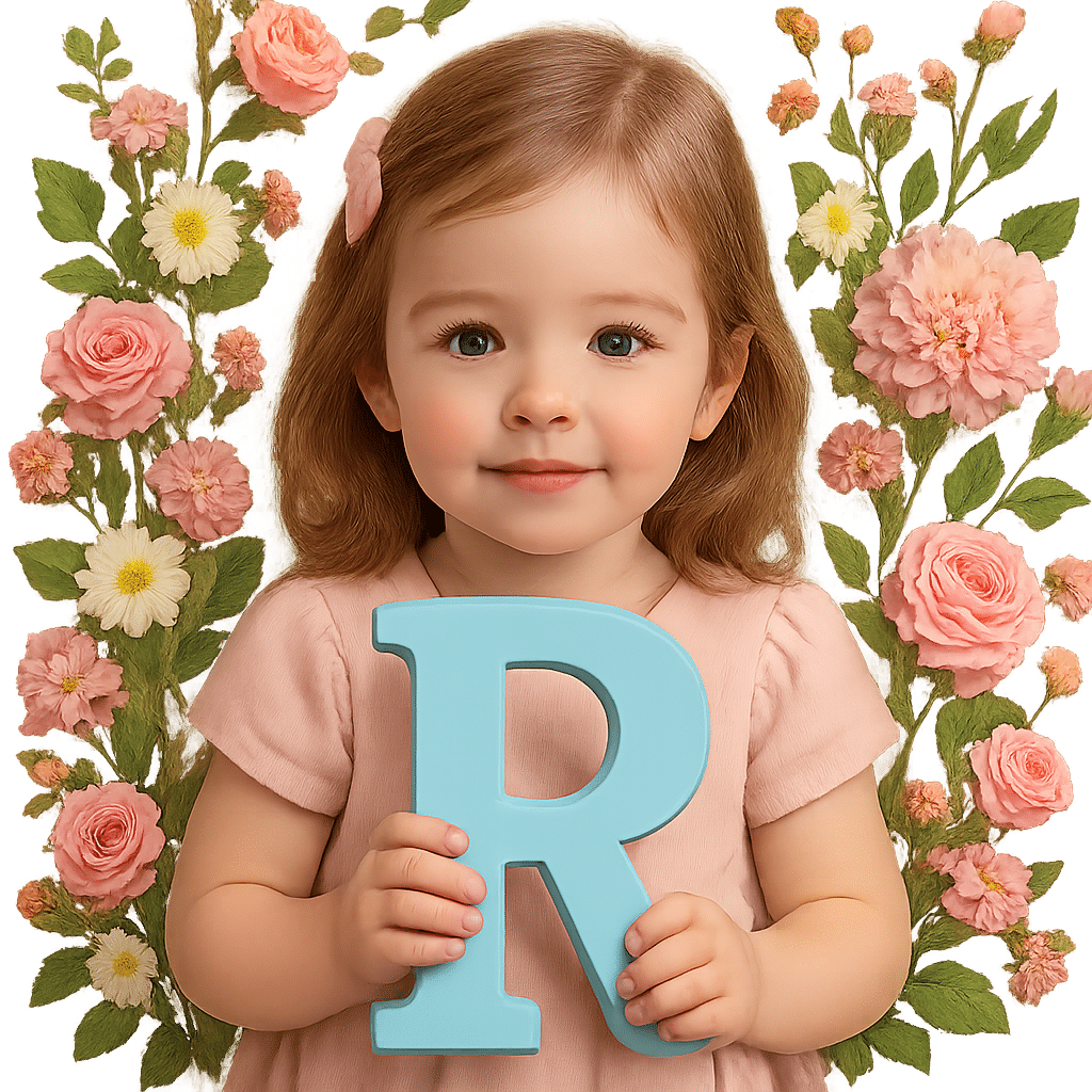 Lille pige holder pastelblåt bogstav R omgivet af blomster – symbol på unikke og yndige pigenavne, der starter med R