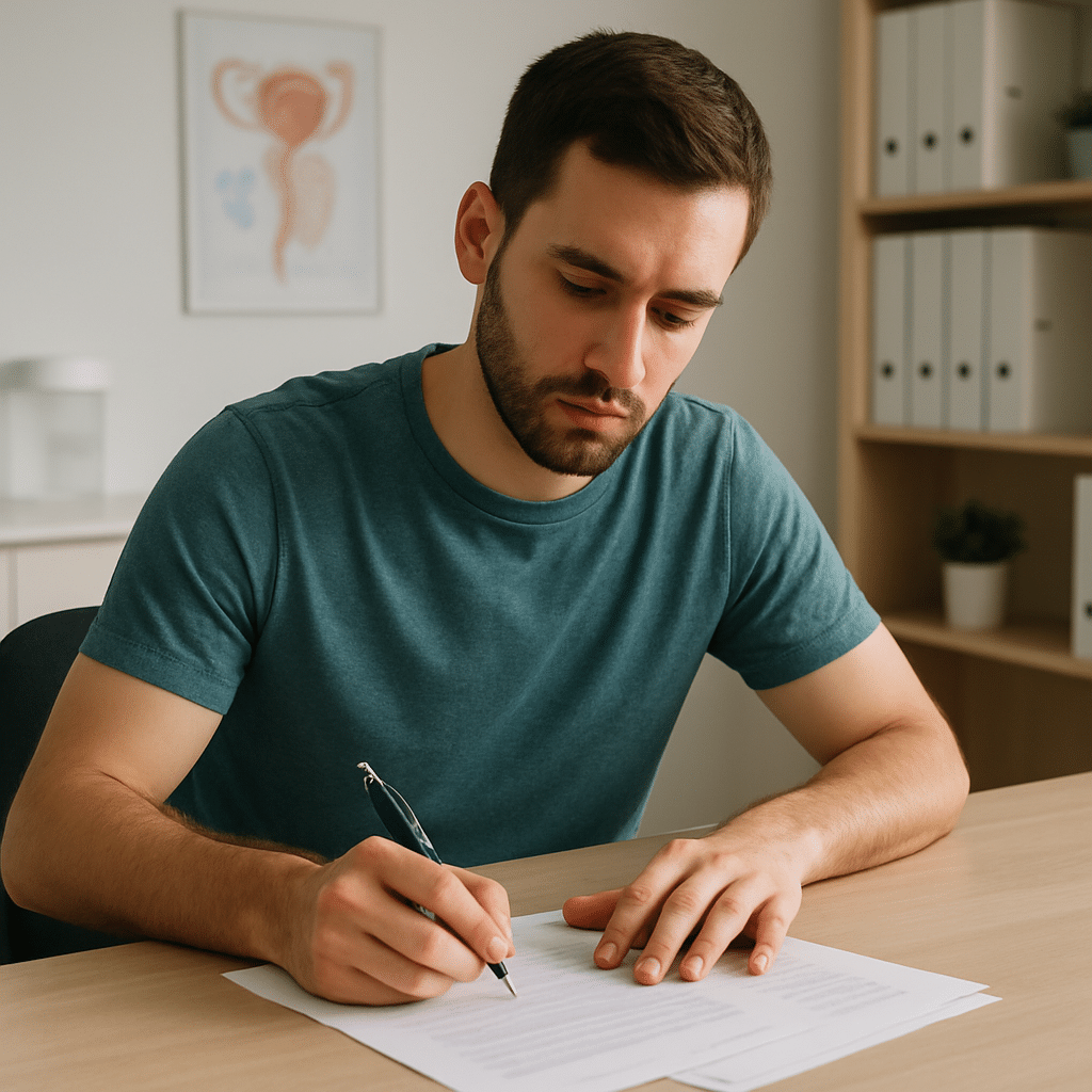 Mand på fertilitetsklinik underskriver dokumenter om sæddonor-løn ved skrivebord med pen og papirer