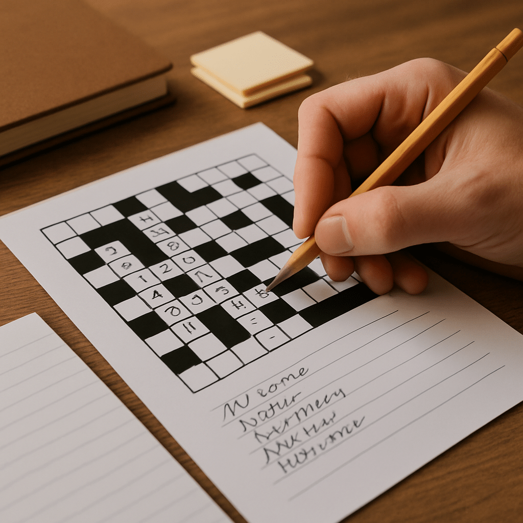 Nærbillede af hånd, der skriver tv serie-titler i krydsord med blyant og noter på et skrivebord