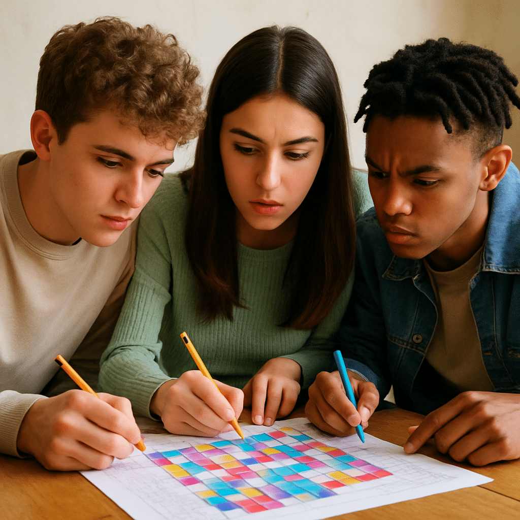 Gruppe unge løser farverigt krydsord ved bordet med blyanter, koncentrerede om sjove og udfordrende hjernetræningsgåder