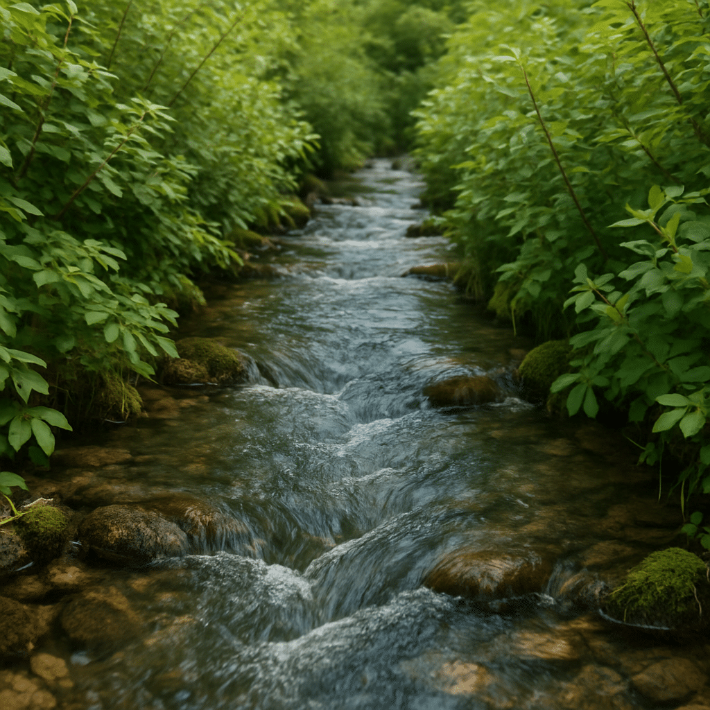 Nærbillede af et klart rindende vandløb mellem grønt buskads – perfekt motiv til krydsord om vandveje.